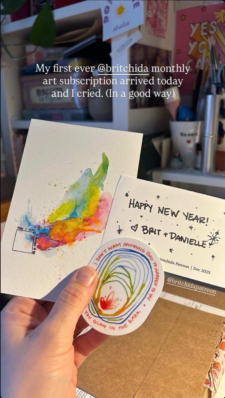 Here’s a photo that a member @the.dopamine.studio shared with me after receiving their first month’s art. These were the rewards for the December 2025 ‘Best Of + Sticker’ tier.